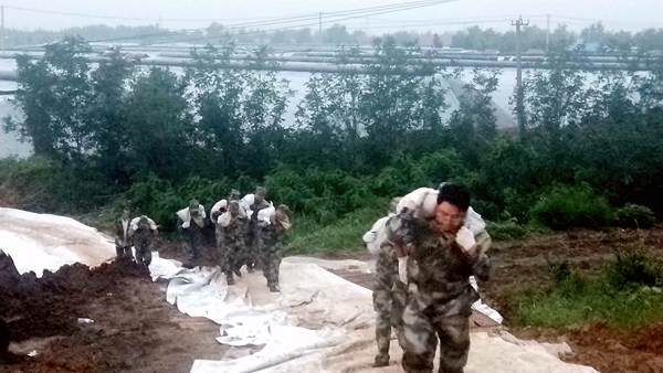 險(xiǎn)情就是集結(jié)號(hào),救災(zāi)就是沖鋒號(hào)。滿是泥濘的救災(zāi)現(xiàn)場(chǎng),臨時(shí)磚路的旁邊就是深淺不一的河溝。在往返兩千多米的泥路上,孚日民兵留下了奮戰(zhàn)的身影,在機(jī)械設(shè)備難以進(jìn)場(chǎng)的情況下詮釋了強(qiáng)大的戰(zhàn)斗力。帶隊(duì)上陣的李洪甲已年近半百,仍毅然和隊(duì)員們還一起肩扛沙袋向著岸堤沖鋒。