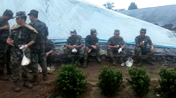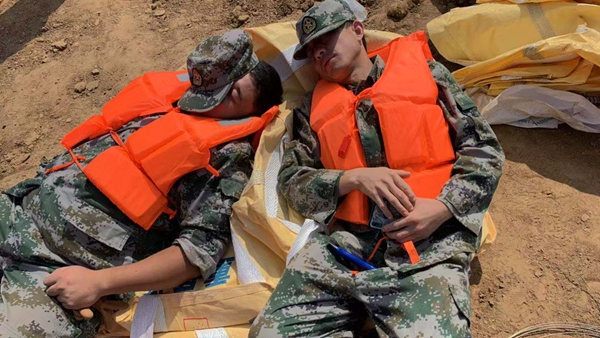 8月15日,孚日集團(tuán)民兵分隊(duì)搭乘沖鋒舟,前往張僧河?xùn)|岸裝填沙袋,參與完成最后的決堤合攏任務(wù)。挖掘機(jī)等大型機(jī)械投入救災(zāi),民兵們的號(hào)子聲、腳步聲和機(jī)械作業(yè)聲交織,大家意志堅(jiān)定為同一個(gè)目標(biāo)拼搏,終于將肆虐的洪水?dāng)r在了河道之內(nèi)。至此,民兵們已經(jīng)好幾天沒(méi)見(jiàn)過(guò)床了——累了,他們就地休息,餓了,他們匆忙進(jìn)食。
